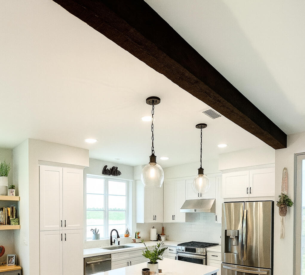 Decorative ceiling solutions including wood beams, ceiling slats, and custom ceiling features that enhance interior design.