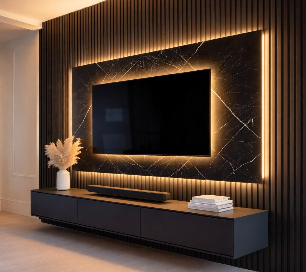 TV media walls with decorative panels, LED lighting, fireplace build-outs, and concealed wiring. Designed for modern Florida homes.